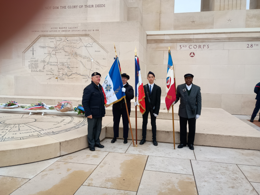 La cérémonie s’est déroulée en trois lieux différents : au monument de la place Doumer puis, face à celui de la 3ème division des forces américaines et, enfin au monument américain de la Côte 204. Elle s’est terminée par un concert exceptionnel organisé par l’association du souvenir français, en présence de nombreux élus locaux, régionaux et départementaux, de dignitaires des ordres nationaux. Etaient également présents, le Lieutenant Colonel Michel VERA, délégué militaire départemental adjoint, du Lieutenant Colonel Henri CARON, délégué général du souvenir français. L’hommage rendu aux héros de 14-18 a été rehaussé par la présence d’un piquet d’honneur composé de militaires en arme du 14ème RI de SISSONNE mais aussi par la présence de nombreux porte-drapeaux dont celui de notre section accompagné par le président Robert STANISLAWSKI et les compagnons de l’arrondissement.